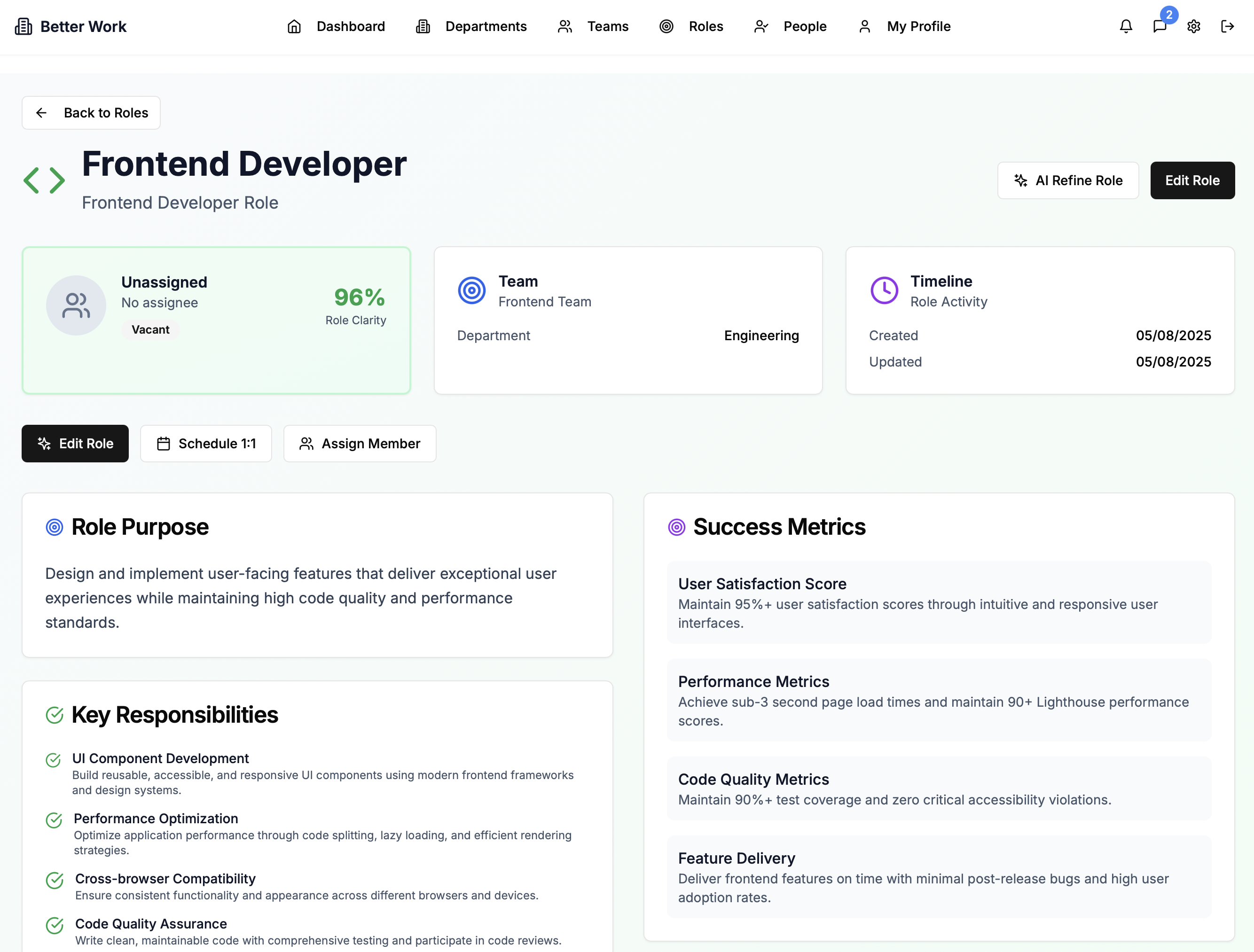 Most companies begin by rolling out Better Work to one or two teams. Define roles, publish your “how we work,” and start using 1:1s and feedback tools. From there, you can expand training, goals, and alignment across the business.